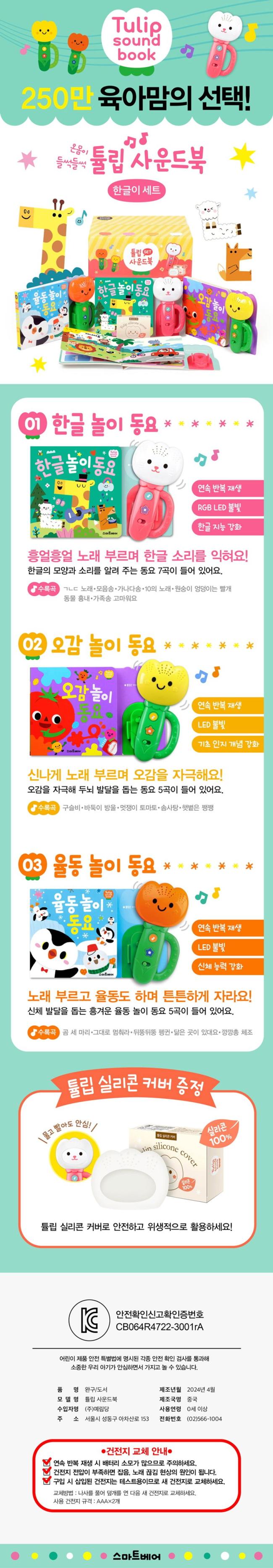 튤립 사운드북 한글이 세트에 구성된 사운드북은 업그레이드 버전으로, 모든 권에 오토리버스 기능이 추가되어 동요가 끊김 없이 연속으로 반복 재생됩니다. 또한 이번 세트에는 구강기 아이들을 위한 실리콘 커버를 사은품으로 제공하여 더욱 안전하고 위생적으로 튤립 사운드북을 즐길 수 있습니다. 소중한 우리 아기에게 언제 어디서나 다양하고 즐거운 동요를 들려주세요.