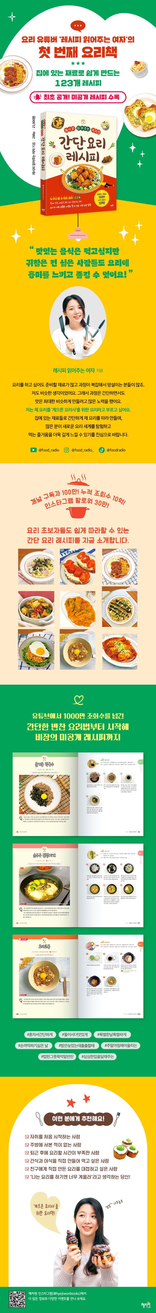 저자 : 레시피 읽어주는 여자 맛있는 걸 좋아하지만 게으르고 느긋한 성격 덕분에, 어린 시절부터 집에 있는 재료로 간단하고 효율적으로 음식을 만드는 방법을 연구해왔습니다. 2021년 9월 유튜브 채널 ‘레시피 읽어주는 여자’를 시작하여 그동안 만들어온 ‘최상의 맛은 아니더라도 노력과 재료에 비해 만족스러운 음식’을 소개하기 시작했습니다. 지금까지 자취생이나 요리 초보자들도 쉽게 따라할 수 있는 요리 레시피를 소개해왔으며, 간단하면서도 창의적인 요리로 많은 사랑을 받았습니다. 2025년 1월 기준으로 유튜브에 업로드된 영상은 800편 이상으로, 구독자 100만, 누적 조회수 10억 회, 인스타그램 팔로워 30만 명을 달성했습니다. 유튜브 : youtube.com/@food_radio/videos 인스타그램 : @food_radio_