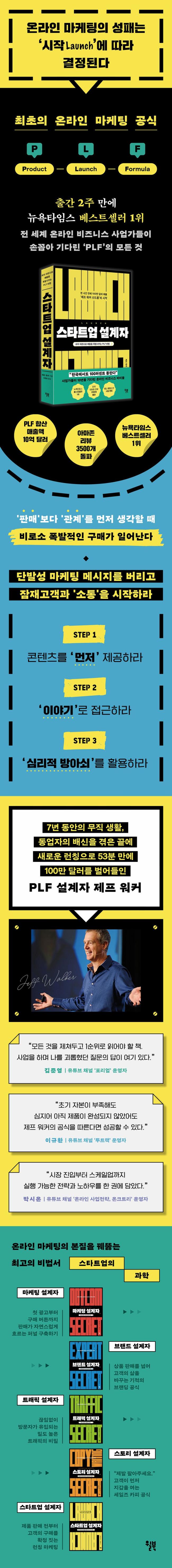 인터넷이 연결되어 있는 모든 곳에서 PLF는 효과를 낸다” 인터넷과 디지털 미디어의 본질을 파악한 최초의 온라인 마케팅 전략서 『스타트업 설계자』는 인터넷 성장이 비즈니스에 가져올 변화를 정확히 파악하고 온라인 마케팅의 완전히 새로운 길을 연 책이다. 이 책의 저자이자 “53분 만에 100만 달러의 매출을 올린 사람”으로 온라인 비즈니스 업계를 뒤흔든 제프 워커가 직접 설계한 제품 런칭 공식 ‘PLF’의 모든 것을 이 책에서 밝힌다. 제프 워커는 1996년, 지하실에서 노트북 한 대로 19명에게 보낸 뉴스 레터를 시작으로 온라인 마케팅의 본질에 대해 탐구하기 시작했다. 그는 인터넷 시장의 규모가 커지면서 소비자들에게 몰아치는 광고 폭탄을 보며, 더 이상 단발성 마케팅 메시지로는 고객을 끌어당길 수 없음을 직감했다. 바로 이때 제프 워커가 생각한 대안책이 고객과의 ‘소통’이다. “이 제품이 좋습니다”가 아니라 고객이 필요하고 궁금한 것을 ‘질문’하고 ‘대화’를 시작해야 한다는 것이다. 고객에게 제품 판매자가 아니라 문제를 해결해주는 사람에서 출발하는 것이 PLF의 본질이자, 격변의 인터넷 시장에서 한 번도 흔들리지 않은 온라인 마케팅의 정수다. 이 책은 한 마디로 초 단위로 업체 순위, 광고 메시지가 바뀌는 인터넷 공간에서 영원히 변하지 않는 본질인 ‘소통’과 ‘관계’를 어떻게 온라인 비즈니스에 긴밀하게 적용할 수 있는지 알려주는 비법서다. “한국에서도 100% 통한다.” 이미 시차를 뚫고 제프 워커의 PLF 온라인 세미나를 들은 국내 사업가들이 입을 모아 하는 말이다. 인터넷이 연결되어 있다면 어떤 대륙이든, 판매자가 누구든 상관없이 PLF는 효과를 낸다. “한 권만 읽어도 바로 실전에서 적용할 수 있다” 전 세계 마케터와 사업가가 기다려온 ‘런칭’ 개념 창시자의 치밀한 마케팅 설계도 이 책의 특별한 점은 1996년 처음 PLF를 설계했을 때의 본질에 더하여 20년이란 시간 동안 덧붙여온 모든 요소를 한 권 안에 완벽하게 해부해냈다는 점이다. 제프 워커는 PLF가 왜 효과가 있는지, 진행에 필수가 되는 요소들, 순차적인 타임라인, PLF를 실행해본 사람들의 이야기 등 바로 실전에서 적용할 수 있도록 PLF의 모든 것을 세 개의 부에 걸쳐 일목요연하게 정리했고 처음 시작하는 사람이 알아두면 좋을 노하우와 경력에서 나온 팁들을 맨 뒤의 4부에서 모두 공개한다. PLF의 인기가 절정을 달렸을 무렵부터 제프 워커의 런칭 과정을 따라가며 짜깁기한 자료들이 무성했던 것이 사실이다. 그러나 제프 워커는 “PLF의 진행 과정을 세세하게 관찰하면서 성공 요인을 찾으려는 사람들이 많은데, 이런 방법으로는 PLF의 성공 요인을 ‘전부’ 찾아낼 수는 없다”고 말한다. 그만큼 PLF는 과정의 단계가 중요한 매우 세밀하고 전략전인 마케팅 공식이기에 그 설계자만이 본인의 언어로 풀어낸 전략서가 필수적이다. 시차를 뚫고 제프 워커의 온라인 세미나를 듣는 전 세계의 사업가들도 이 책이 각국의 언어로 출간되길 간절하게 기다린 이유이기도 하다. “이 책에 나오는 숫자는 모두 진짜다” PLF로 180도 달라진 인생을 사는 사업가들의 생생한 경험담 “과연 내가 잘할 수 있을까?” 스스로를 의심하고 계속 도전을 망설이는 사업가들에게 스타트업 설계자는 국적, 나이, 직업에 관계 없이 누구나 온라인 비즈니스로 꿈꾸던 사업을 시작할 수 있음을 실제 사례로 보여 준다. 미국의 저소득층을 위한 식품 지원 사업인 푸드 스탬프를 받으며 생계를 이어나갔지만, PLF를 통해 연간 100억 달러 기업의 CEO가 된 가장의 이야기부터 사고로 더 이상 공연을 할 수 없게 되어 완전히 다른 방향의 온라인 강연 사업을 선택해 제2의 삶을 사는 아티스트, 환갑이 넘는 나이까지 회사에 재직하다 취미를 사업으로 전환시키기 위해 웹페이지를 만들어 완판 행렬을 만든 사람까지 그 사례는 매우 다양하다. 뿐만 아니라 이들의 사례에는 PLF를 처음 자신의 사업에 적용하게 된 구체적인 전환 시점과 제품에 맞게 조금씩 변형한 부분 같은 전략적 판단 과정들도 상세히 이야기해주고 있어, 살아 있는 인사이트를 얻을 수 있다.