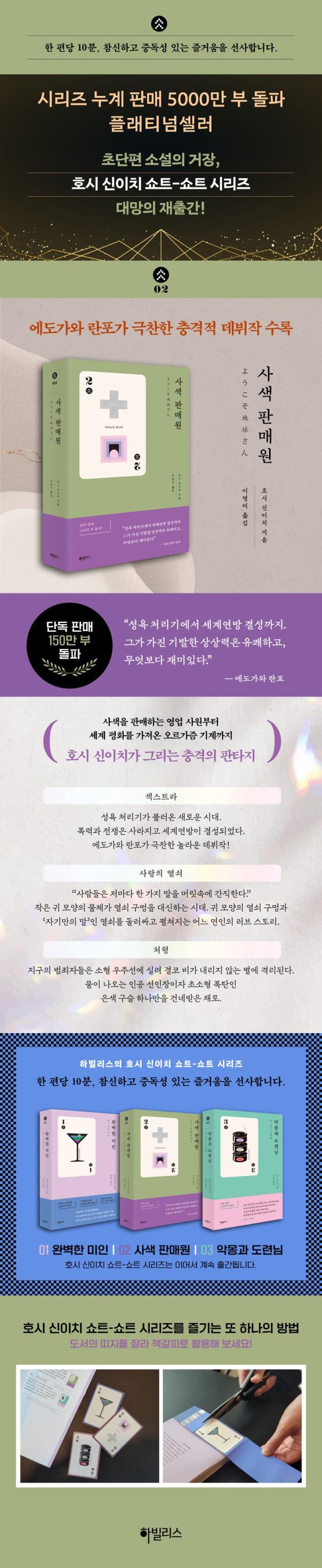 | 현대 SF소설 및 대중문화, 서브컬처에 이르기까지 폭넓은 영향을 끼친 호시 신이치 쇼트-쇼트 시리즈 대망의 재출간! ★시리즈 누계 판매 5000만 부 돌파 플래티넘셀러★ “한 편당 10분, 참신하고 중독성 있는 즐거움을 선사합니다.” 일본 SF의 전설, 일본의 국민 작가, 그리고 초단편 소설의 거장 호시 신이치. 일찍이 그의 재능을 알아본 에도가와 란포에 의해 전격 데뷔한 이래로, 호시 신이치는 ‘세기의 천재’라는 수식어에 걸맞게 200자 원고지 20매 분량의 초단편 소설 형식인 ‘쇼트-쇼트’라는 장르를 개척하고, 전 생애에 걸쳐 1000편 이상의 쇼트-쇼트 작품을 발표했다. ‘누계 판매 5000만 부’ ‘전 세계 30개국 이상에서 번역 출간’ 등 경이로운 기록들을 계속해서 갈아 치우고 있는 쇼트-쇼트 시리즈. 그 명성에 걸맞게 호시 신이치의 작품은 일본 후지 TV, NHK 같은 쟁쟁한 방송국에서 여러 차례 영상화된 바 있으며, 한국에서 연극으로 각색되기도 했다. 그의 단편들은 2008년 국내에 처음 소개된 이후, 안타깝게도 절판되어 오랫동안 구할 수 없었다. 그런 만큼 새로운 번역과 편집으로 구성된 하빌리스의 〈호시 신이치 쇼트-쇼트 시리즈〉는 그의 작품이 재출간되기를 바란 많은 독자들에게 반가운 소식이 아닐 수 없을 것이다. 시리즈를 즐기고 소장하는 독자들 곁에서 오래도록 의미 있게 존재할 수 있도록 띠지 뒷면을 자르면 책갈피가 되도록 구성하였고, 속표지와 커버를 각각 다른 콘셉트로 디자인하는 등, 만듦새에도 특별히 공을 들였다. | 사색을 판매하는 영업 사원부터 세계 평화를 가져온 오르가즘 기계까지, 호시 신이치가 그리는 충격의 판타지! ★단독 판매 150만 부 돌파★ ★에도가와 란포가 주목한 바로 그 작품, 「섹스트라SEXTRA」외 41편 수록!★ 호시 신이치는 일본이 아직 SF의 불모지였을 무렵부터 SF 동인지인 《우주인》 창간에 참여해 누구보다 적극적으로 작품 활동을 이어 간 작가이기도 하다. 그런 그의 재능을 알아본 사람이 바로 일본 추리소설의 거장 에도가와 란포다. 란포는 《우주인》에 실린 「섹스트라」를 보고 다음과 같이 이야기하며 호시 신이치를 상업지에 전격 데뷔시킨다. “성욕 처리기에서 세계연방 결성까지. 그가 가진 기발한 상상력은 유쾌하고, 무엇보다 재미있다”. 『사색 판매원』은 인류를 기다리고 있는 미래의 희비극을 호시 신이치 식으로 풀어낸 우화집이다. 란포의 평처럼, 이 책에는 사색을 판매하는 영업 사원부터 고과考課에 전전긍긍하는 천사들, 세계 평화를 가져온 오르가즘 기계까지 ‘어떻게 이런 이야기를 떠올릴 수 있을까?’ 싶은 유일무이한 에피소드들이 끊임없이 펼쳐진다. 데뷔작과 초기 작품들이 다수 수록되어 있는 만큼 도발적이고 재기발랄하지만 전설의 클라스를 보여 주는 ‘클래식’임은 의심의 여지가 없다. | 기상천외하고도 탁월한 아이디어에 보편성을 더하다 『사색 판매원』은 쇼트-쇼트 시리즈 중에서도 조금 특별한 구석이 있는 책이다. 이 책에는 기상천외한 아이디어로 독자의 눈을 사로잡아 순식간에 예상치 못한 결말로 이끄는 통상의 쇼트-쇼트 작품 외에도 조금 긴 호흡의 작품들이 수록되어 있다. 특히 ‘죽음이란 무엇인가’를 주제로 삼은 「처형」과 「순교」가 대표적이다. 「처형」의 무대는 결코 비가 내릴 일 없는 어느 외딴 행성이다. 지구의 범죄자들은 물이 나오는 인공 선인장이자 초소형 폭탄인 은색 구슬 하나만을 건네받은 채, 소형 우주선에 실려 이 별에 격리된다. 이들을 기다리는 건 극심한 갈증과 배고픔뿐이다. 폭발할지 물을 내놓을지 알지 못한 채, 두려움에 떨며 구슬의 버튼을 눌러 물을 조금 얻고는 다시 두려움에 떨며 버튼을 누르고 물을 얻는 과정의 반복…. 그러다 어느 순간 구슬의 주인이 그 두려움마저 초월하게 되었을 때, 구슬은 찬란한 빛을 내뿜으며 폭발한다. 「순교」에는 사후 세계와 소통할 수 있는 통신기계가 등장한다. 이 기계 앞에서 사람들은 저마다 자기가 신뢰할 수 있는 가족, 친구, 연인을 불러내 이야기를 나눈다. 그러고는 한 치의 망설임도 없이 ‘즐겁게’ 죽는다. 인간에게 남은 마지막 공포이자, 인류를 지탱해 온 유일한 동력인 ‘죽음’을 극복한 것이다. 그 결과, 자살은 유행을 넘어 하나의 신앙이 돼 버리고 만다. 이처럼 「처형」과 「순교」는 삶과 죽음의 가치가 역전되는 순간을 절묘하게 포착해 이를 철학적 수준으로 승화시킨 작품이다. 호시 신이치의 이야기가 세월의 풍화와 격랑에 휩쓸리지 않고 꾸준한 사랑을 받는 가장 큰 이유는 이렇듯 우리의 삶과 맞닿은 보편성을 확보한 덕분이다.